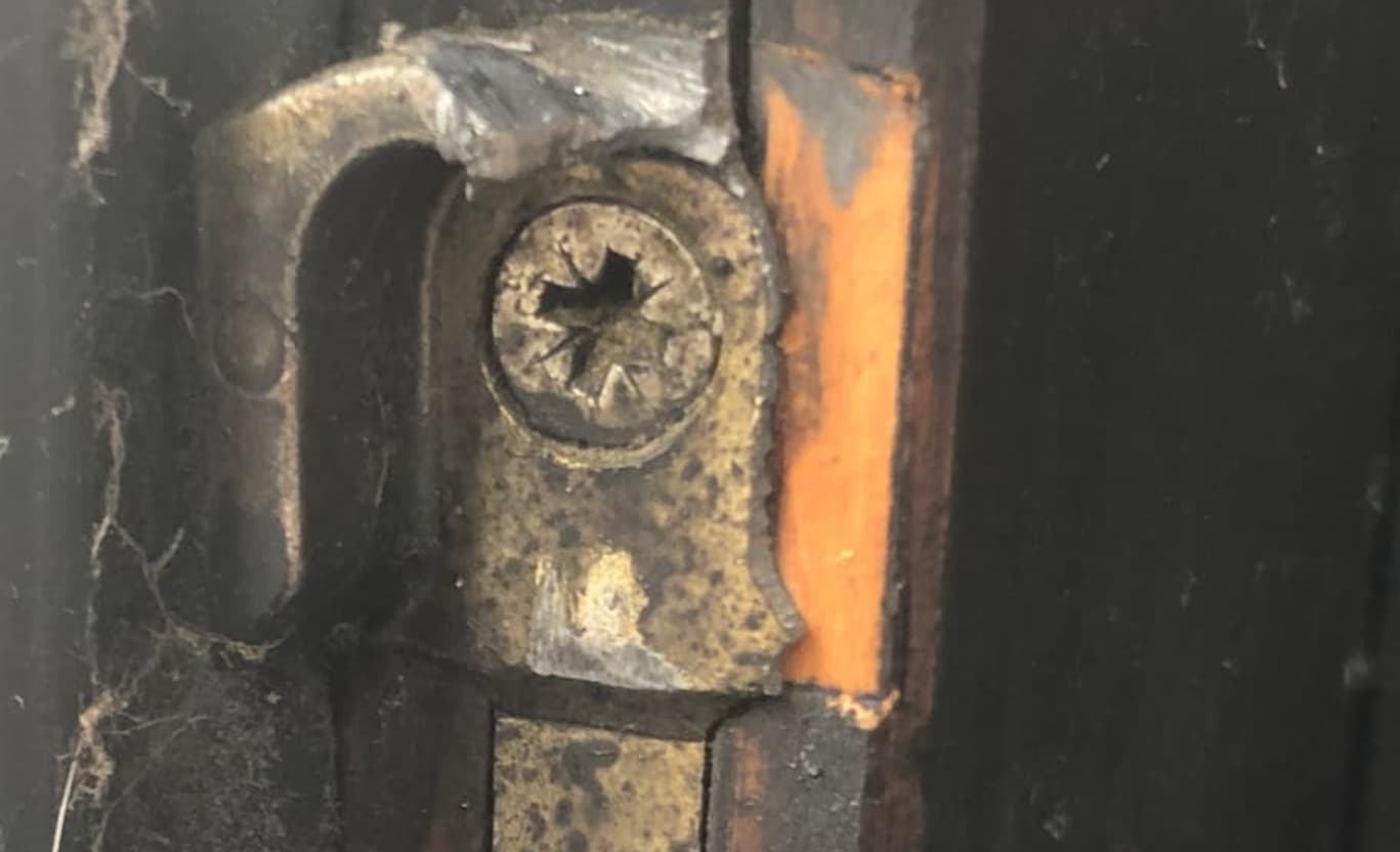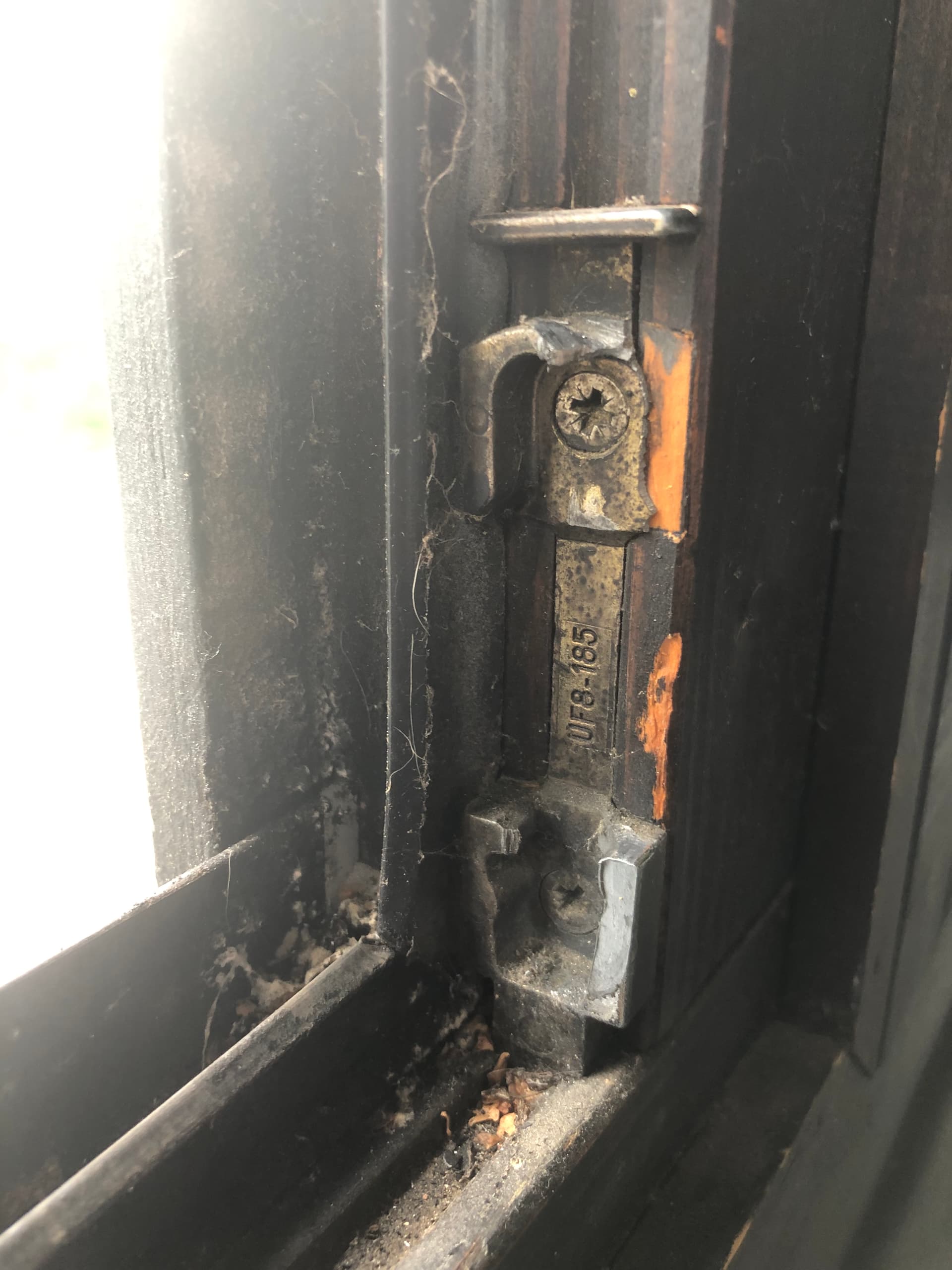 dunno, I don’t see any saw marks, but the upper metal part looks to be chipped off, I guess that’s the inside side so… maybe the window frame got deformed and was just blocking on that part so the tenant decided to fix it that way it instead of fixing the worn out hinges
