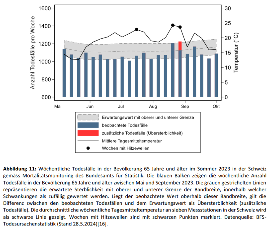 This graph from the Swiss report shows how the deaths related to heat are estimates. A similar number of people dies every week of the year, with a slightly higher average on winter (respiratory diseases). During Spring and Summer weekly deaths fall unless there’s a heatwave where peaks of weakly deaths occur. Of course, it’s only a correlation. Have a drink someone says “correlation is not causation”. From the Swiss numbers from summer 2023 (550 deaths attributed to heatwaves) and around 70k deaths per year, heatwaves are correlated to 0.8% of annual deaths.