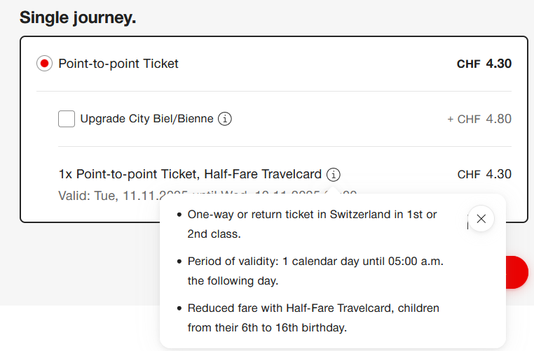 The 4.30 CHF ticket for Biel > Cressier is a point-to-point ticket. Valid only for the train the ticket was bought for.