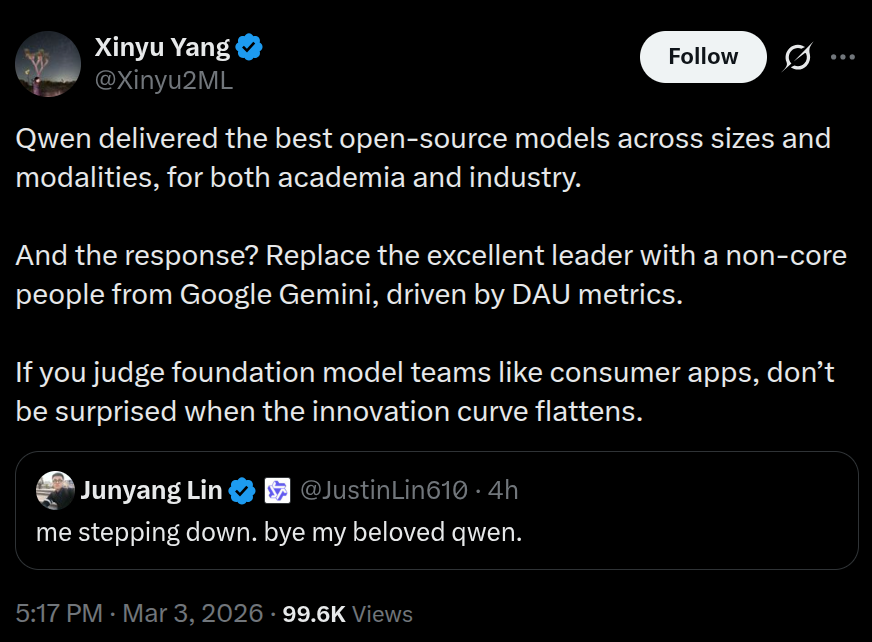 Drama in the Chinese AI scene. Techlead Junyan Lin gets kicked out right after releasing Qwen3.5 (probably the most impressive free AI model right now) - another case where tech talent loses in the Corporate Game of Thrones.