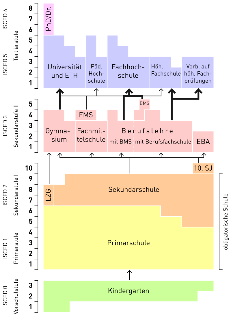 Primarschule, Sekundarschule, Beruflehre, BMS, FHS.