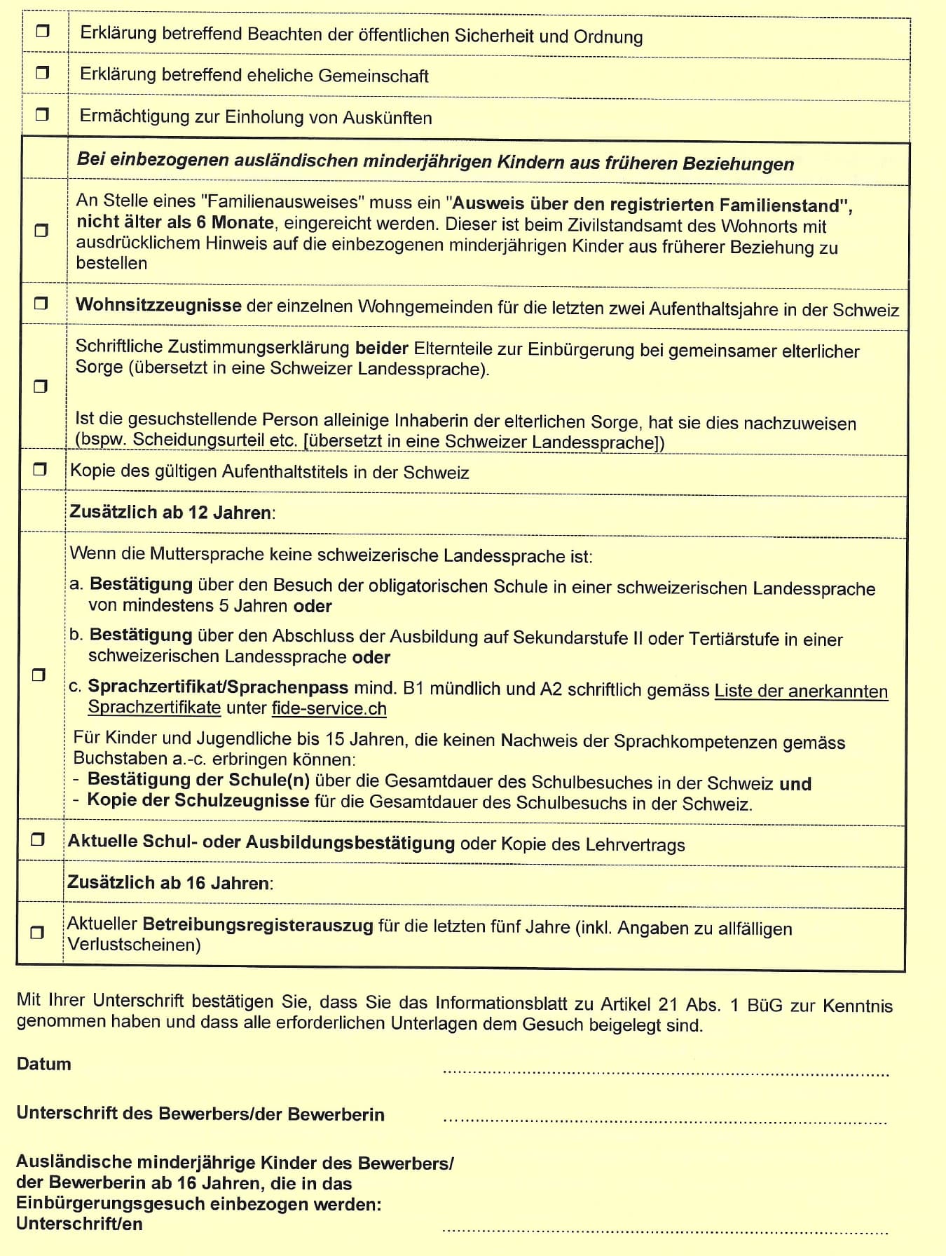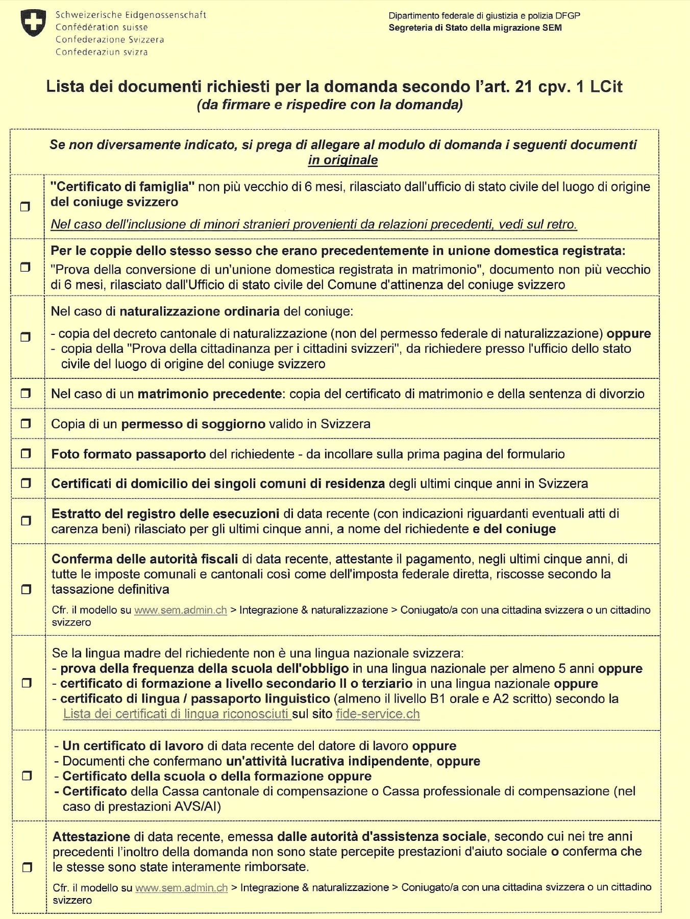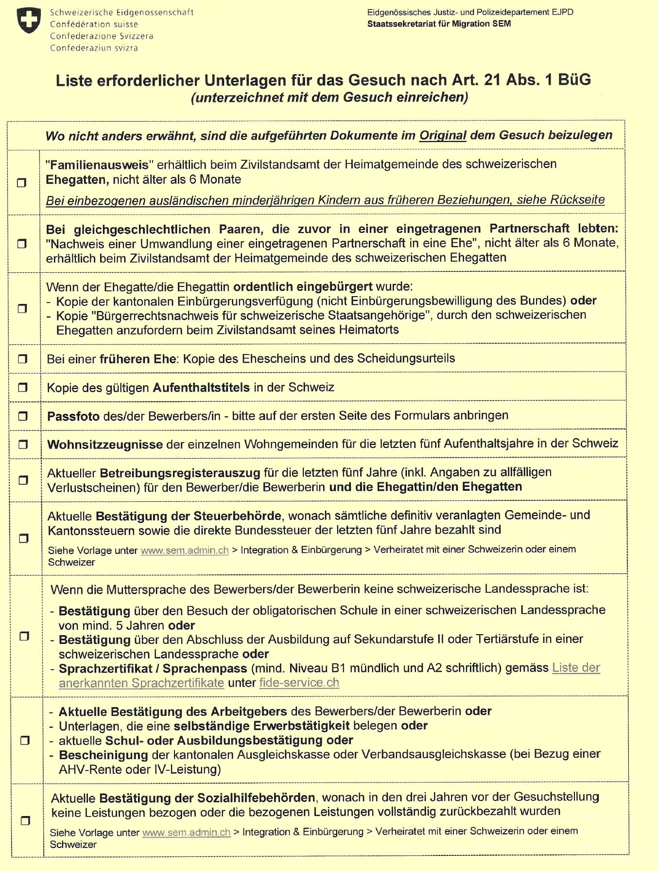 There is a document checklist that is provided by the SEM in Bern to all Kantonâs, and it comes in all 3 official languages. I was given this by my Gemeinde in all languages, however I only needed the German one. The paper is in yellow color. Let me see if I can take a photo and attach it for you guys, I have seen many people asking this info. Normally when they give you the application form, they should also give you this document checklist.