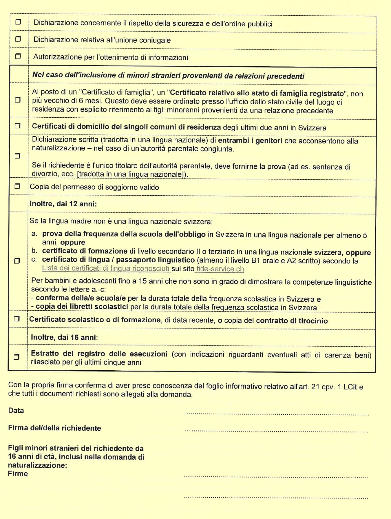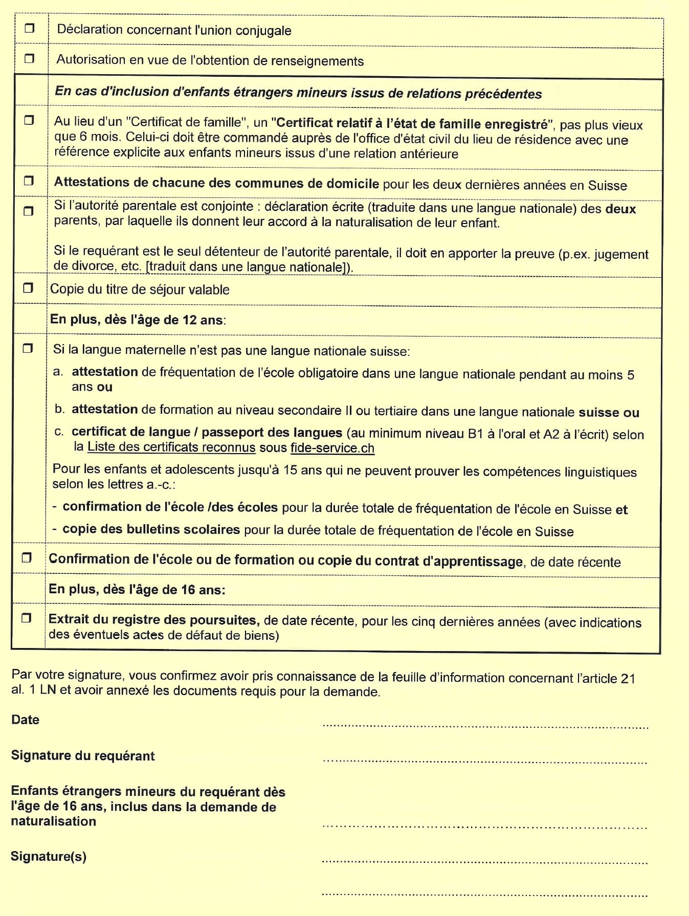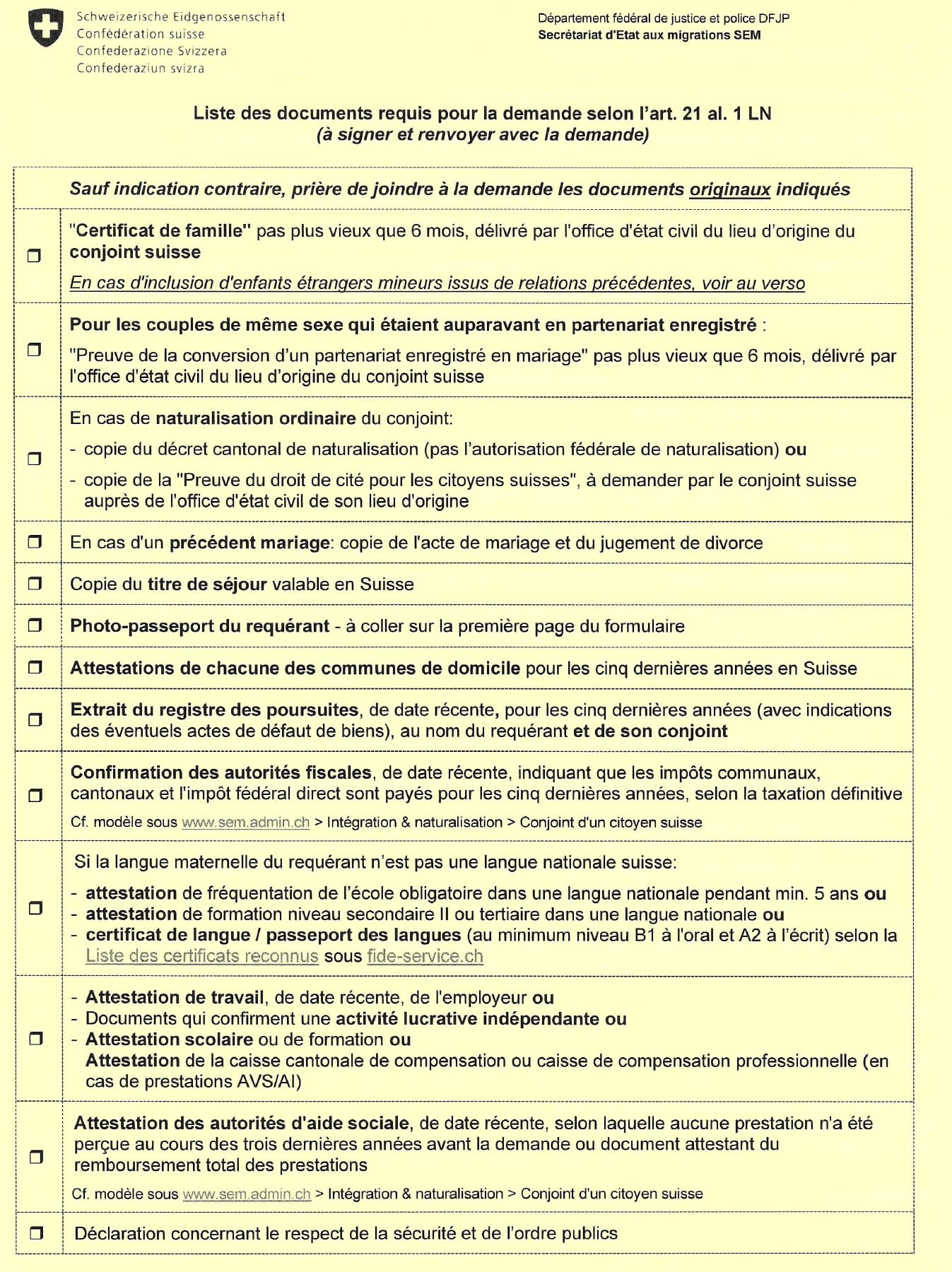 There is a document checklist that is provided by the SEM in Bern to all Kantonâs, and it comes in all 3 official languages. I was given this by my Gemeinde in all languages, however I only needed the German one. The paper is in yellow color. Let me see if I can take a photo and attach it for you guys, I have seen many people asking this info. Normally when they give you the application form, they should also give you this document checklist.