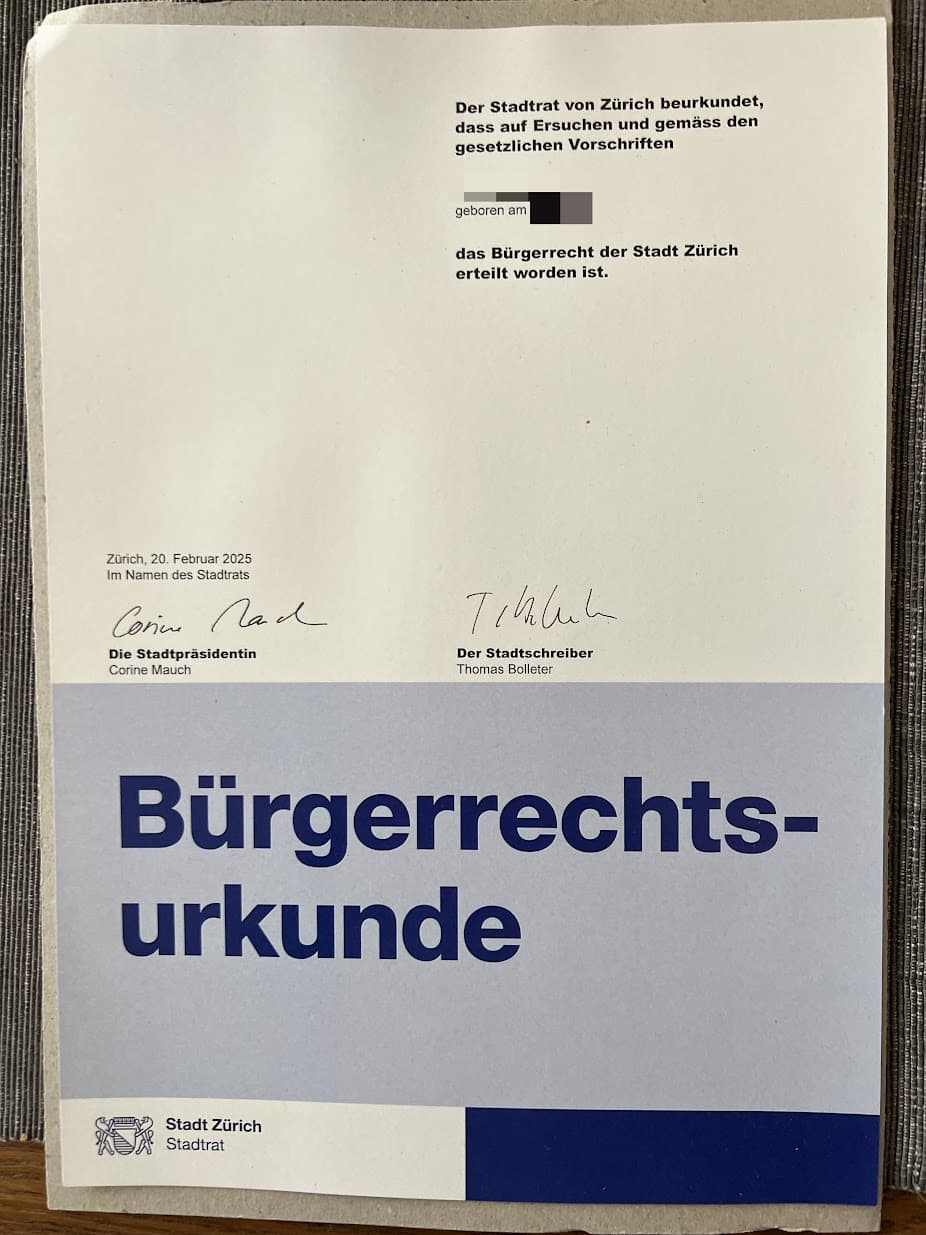 Another letter came from Stadt Zürich with a nice Einbürgerungsurkunde. Everything’s dated 20.02.2025. I called the Zivilstandsamt and they’ve already entered my citizenship into the registry, so I could book a biometrics appointment for getting passport/id for tomorrow!