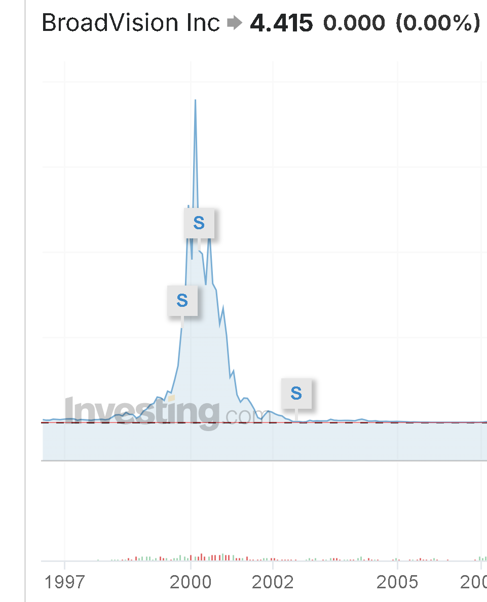 Way back in 1999 I was a consultant with Broadvision. We were one of the main tool providers for building online shops. I personally worked on sites for Mothercare, Dixons and Barclays. Everyone realised that online shops would radically alter the commercial landscape. So everyone piled cash into firms like Broadvision.