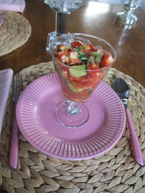 A dish engraved in my memory of a long-ago fishing trip to Baja, where we had prawn cocktail with avocado, jalapeno, tomato, lime, orange, cilantro (coriander), and red onion. It was served in a little cantina with a dirt floor and a resident green parrot who hoovered up under the tables.