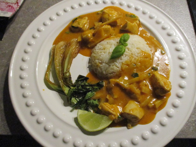 Red Thai curry sauce with strips of bamboo shoot, fresh basil and grated ginger, coconut milk, chicken broth, shallot, sriracha, lime leaf, garlic, and nam pla (fish sauce)–all simmered together until fragrant and thick. Then add chicken breast in generous chunks and gently stew until the meat is just done and still tender. Serve with jasmine rice and bok choy seared in toasted sesame oil. Bamboo shoots, like water chestnuts, have more crunch than taste, but they are great at taking on whatever flavours you throw at them. Lidl sells them in tall jars when Asian Week rolls around.