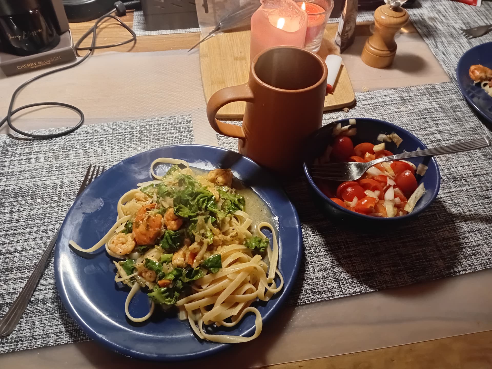 Did not have the reduction from the shrimp shells, so I used wine and fishsauce as a substitute and grated lemon peel and sliced some lemon in the sauce. I also sliced up some rucola in the sauce for a bit of nuttyness