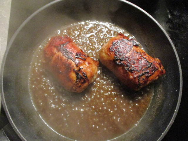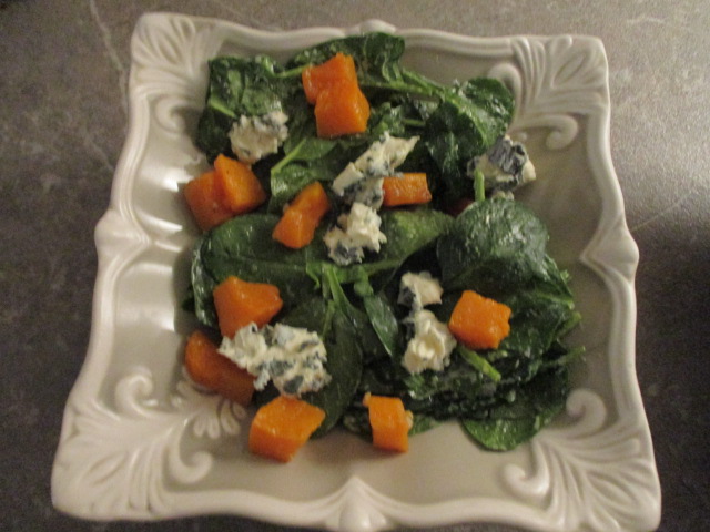 I like fabricating little packages of meat—in this case chicken thighs skinned, boned, and flattened with my trusty mallet. I spread them with caramelised jalapeno peppers, topped that with shredded alpkäse, and wrapped them in clingfilm tightly rolled. Once they held their shape, I exchanged the film for Black Forest ham. They cook quickly in a sauté pan deglazed with stock to make a quick sauce. Served with a baby spinach salad dressed with a marinade from draining a jar of artichokes, cubes of roasted butternut squash, and chunks of Saint Agur cheese. The cheese gives a creamy, gentle, yet distinctly blue-cheese counterpoint to the sweetness of the squash.