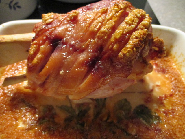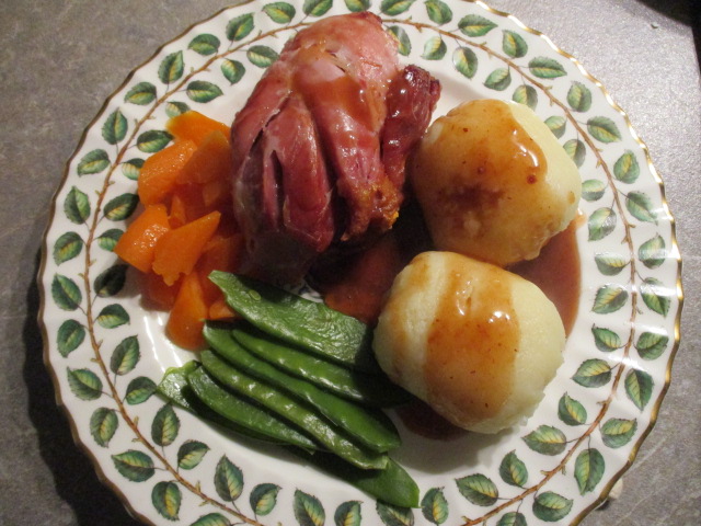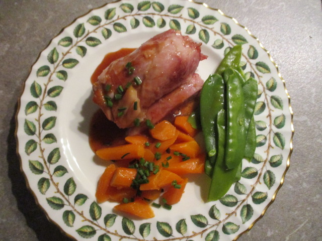 After a week of false spring, an overnight dusting of snow called for slow-cooked pig shank blitzed in the oven to make the crackling crispy. Rather than the usual heavy Germanic sides, I made steamed pea pods, star anise carrots, and a light sauce of Port. (OH had his beloved dumplings, though.) The chives are growing fast in the garden, so I used them for garnish.
