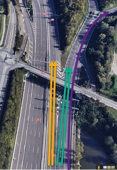 The intersection is actually 3-way: The right lane heads off to the West-Ring on it’s own. The two green lanes go into the Gubrist, but is slowed by out-of-picture merging with traffic coming from Zurich and the West Ring. The yellow goes into Zürich.