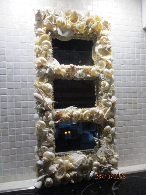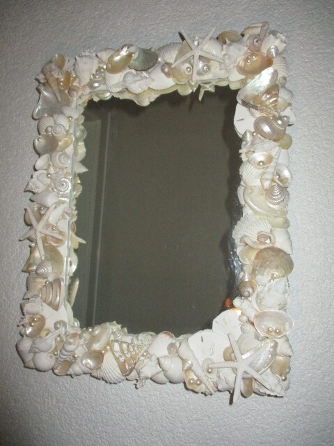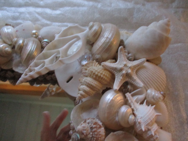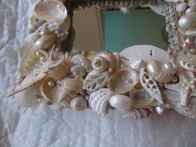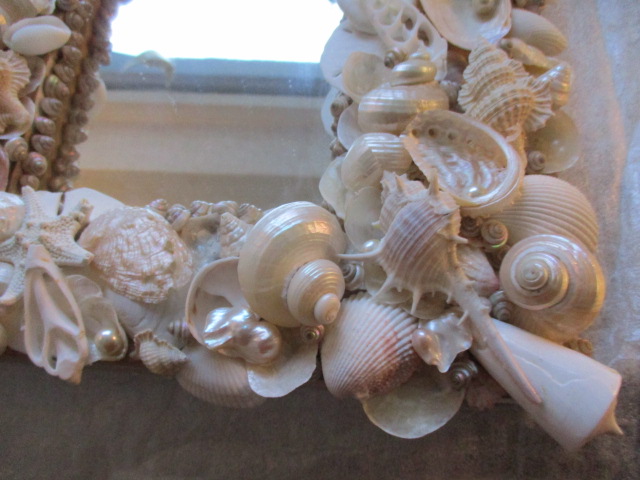 My thing in Florida was making shell mirrors…these things sell in the local markets for hundreds, so I decided to make my own. Then I started making them for charity auction and had a lot of fun doing it. It takes special adhesive–E6000–otherwise the shells won’t stick to anything. I used real fresh-water pearls, and many of the shells were collected on our local beach. (Excuse the finners!)