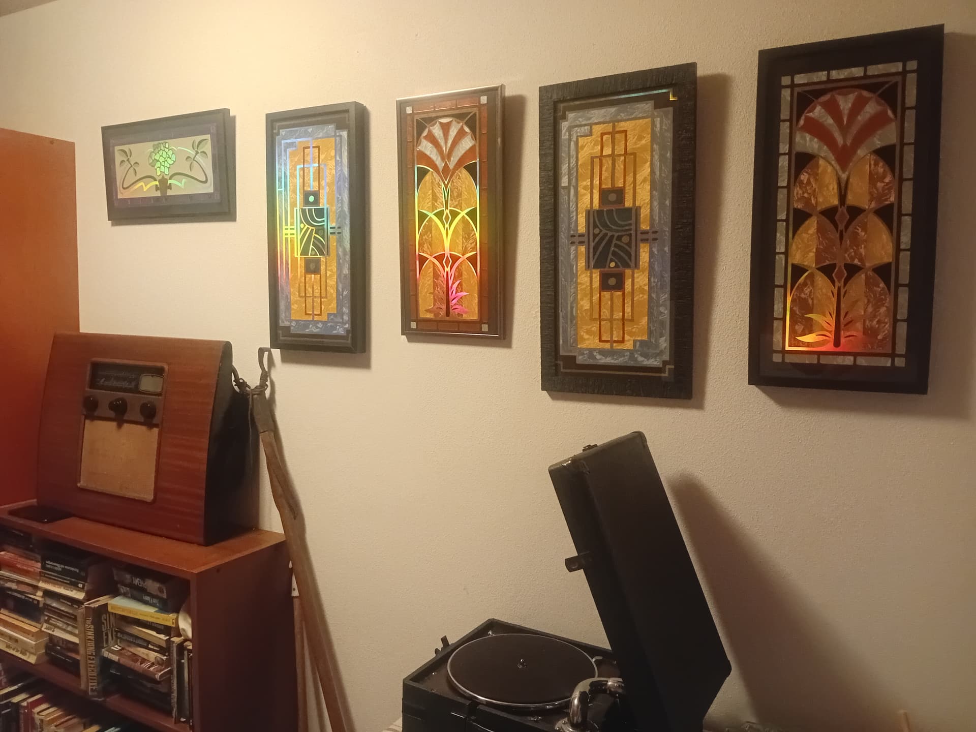 These are intarsien made out of cardstock, cut on a Graphtec plotter and built on a GTO format light table from 1955.