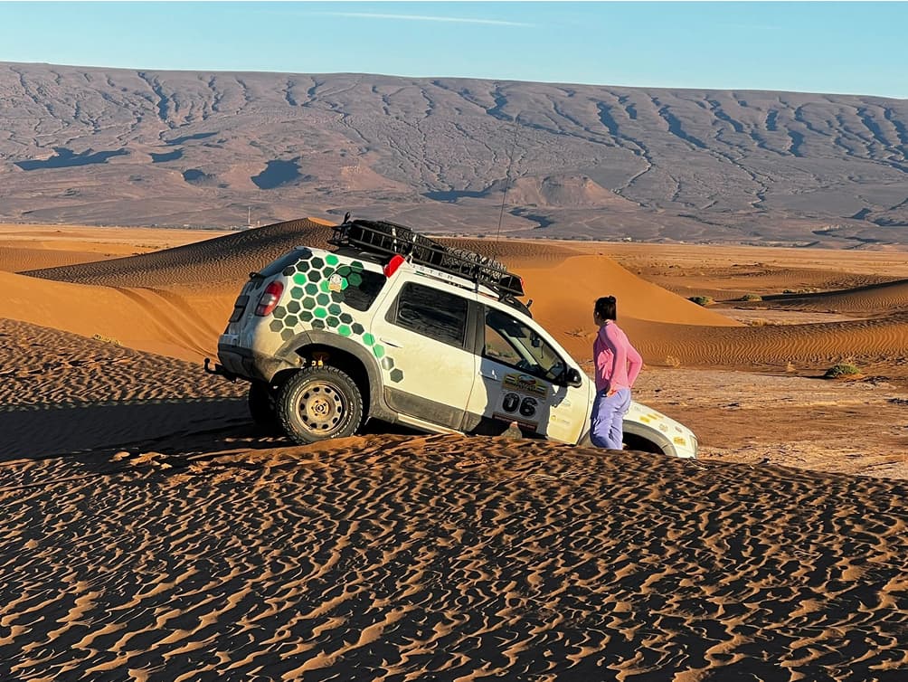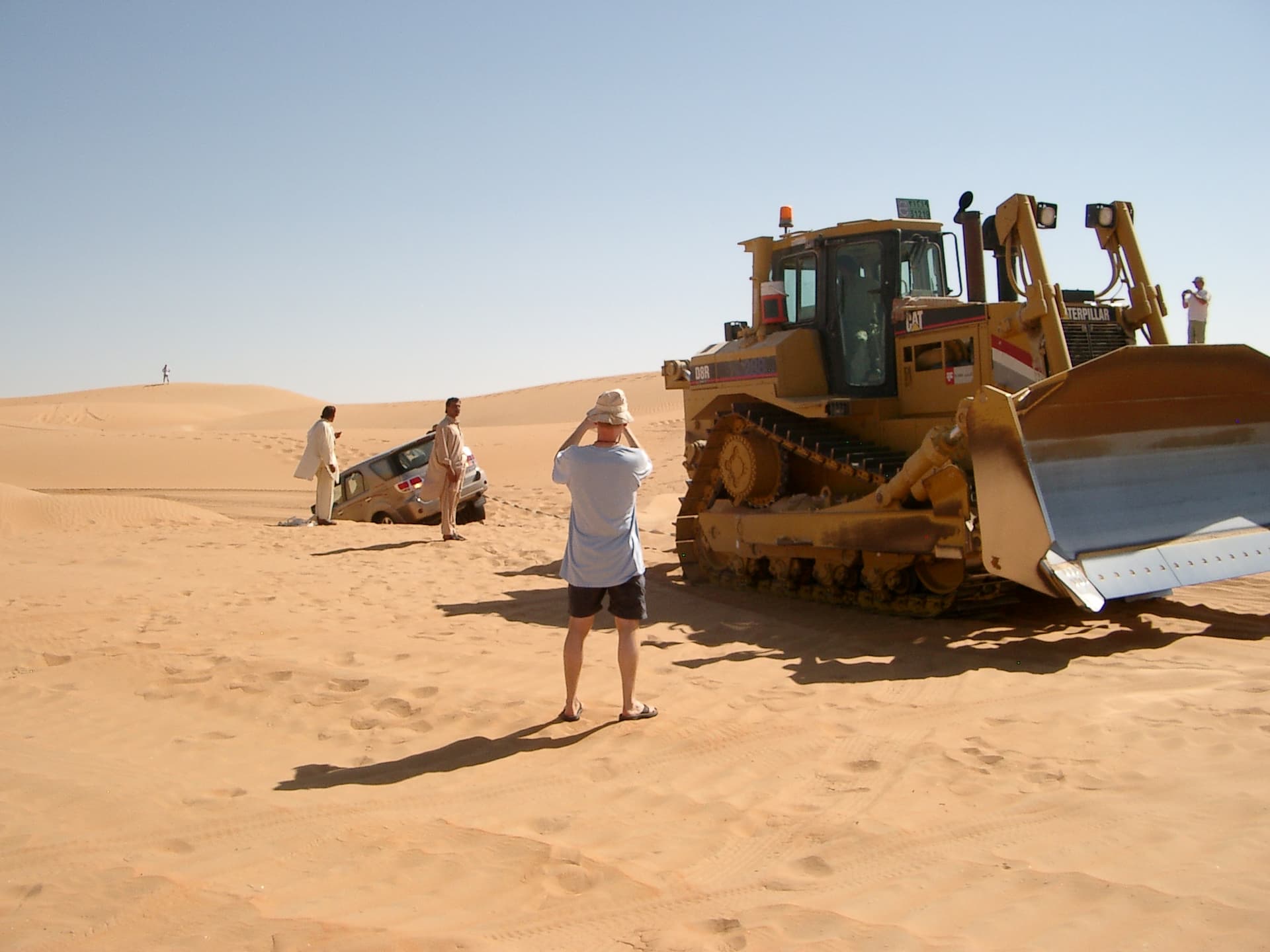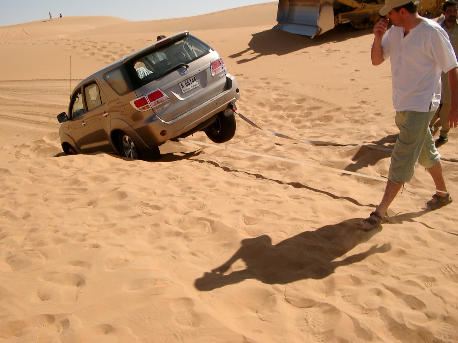 Rally Lite…dune bashing in the Empty Quarter, landing on 1-1/2 wheels. Tried to haul it out with one of the other 4x4s, also stuck. Four people dug for an hour. Thought we were stranded. Saved by locals who happened to be excavating sand in the middle of nowhere.