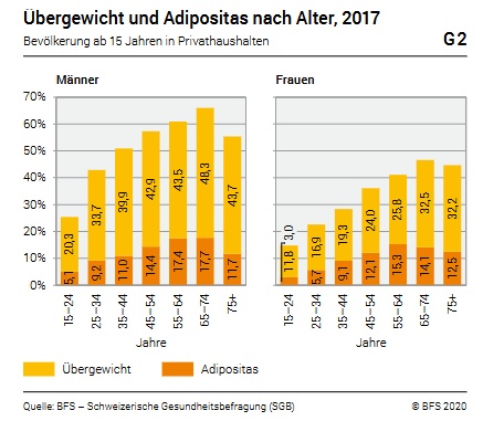 For instance you can see the effect of the “they die” in the obesity-by-age chart. Though probably not undiagnosed, the effect is visible still. The overweight/obese men among the 75+ age group don’t slim down, they die (early) and leave a less obese cohort behind.