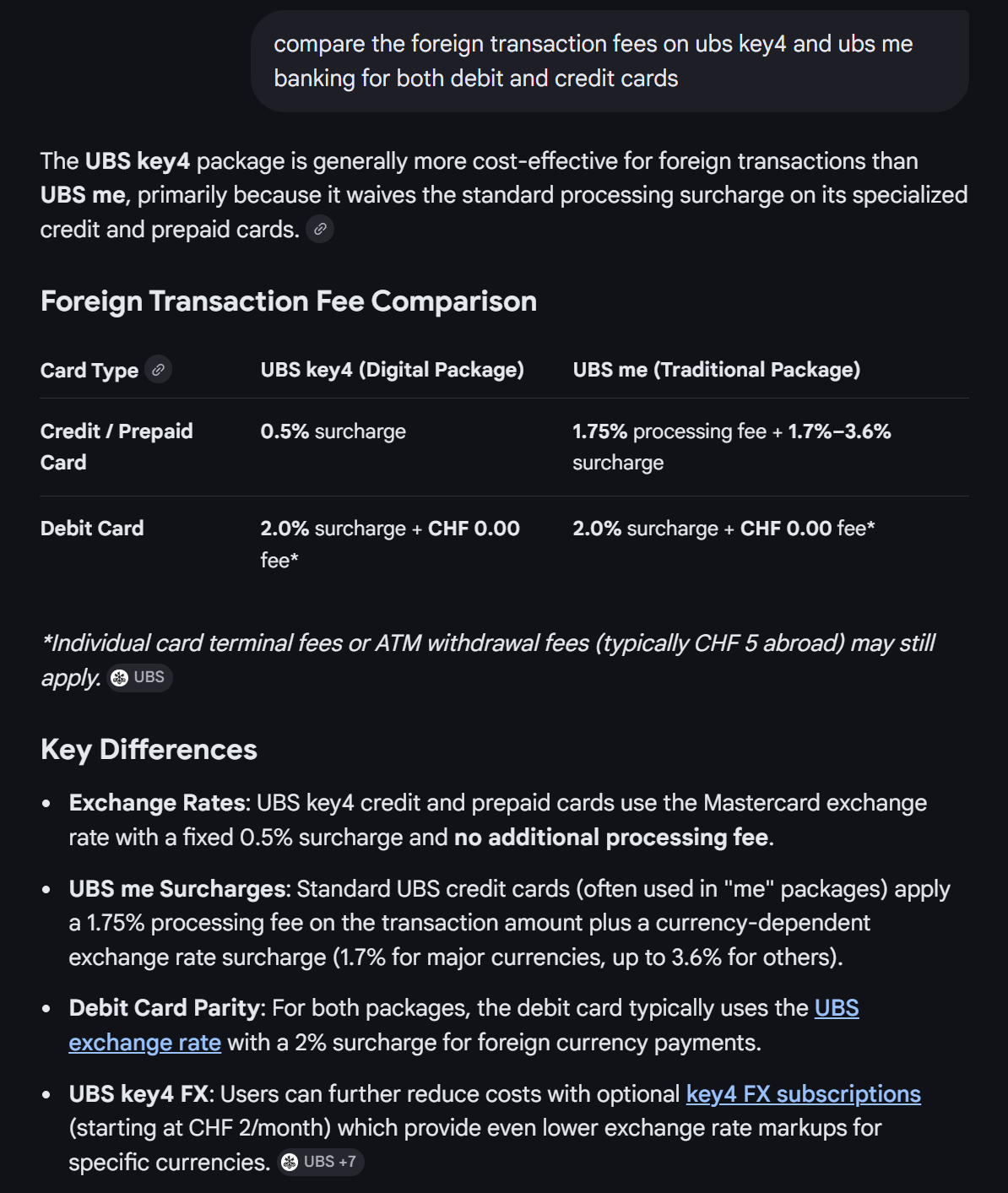 What I mean’t by proper is that, it has branches, ATM machines, has physical presence. By the way I did a quick comparison using Google Gemini for UBS Key4 vs their standard UBS Me Banking package, here are the details for both credit and debit cards.