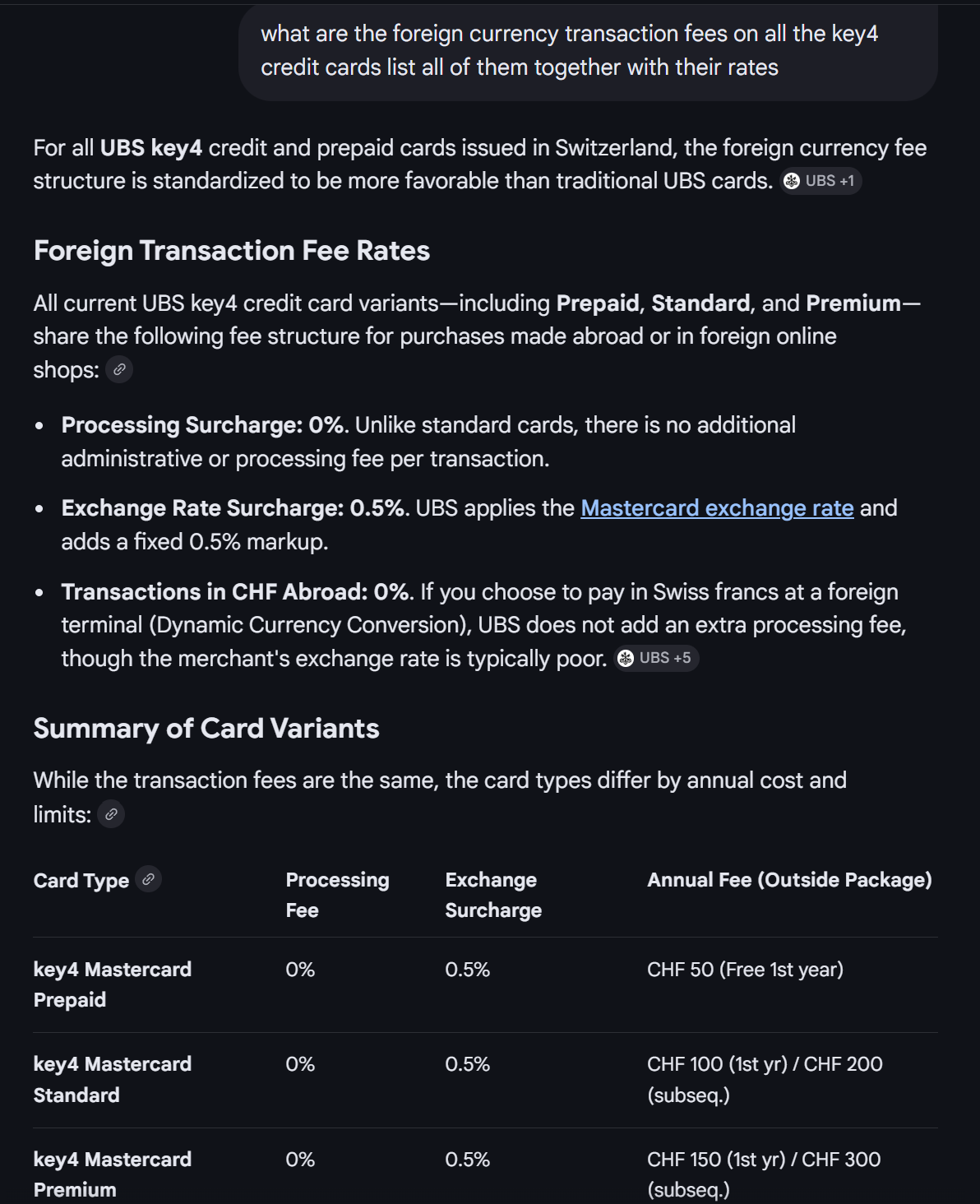 This is incorrect, UBS have a key4 credit card with 0.5% flat on foreign currency rates and use the Mastercard exchange rate, I just checked this with their client advisors like last week.