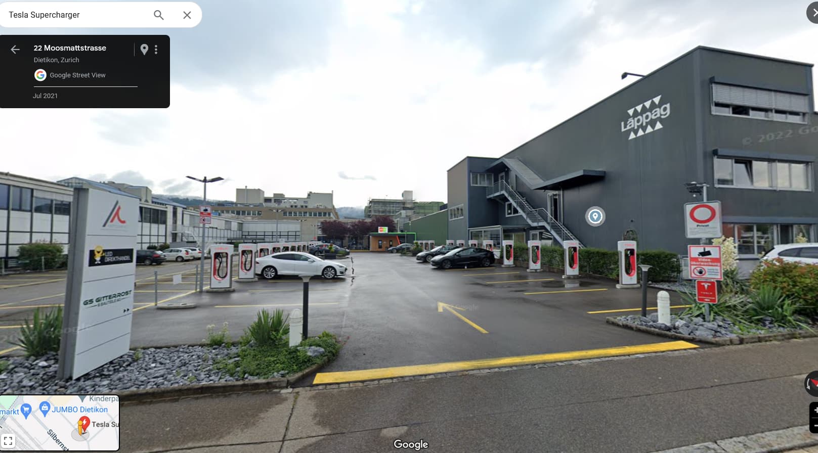 Tesla Supercharger location are somewhat eccentric - sometimes at convention autobahn services, in industrial estates, round the back of carparks (like Glattzentrum) and best of all in the car parks of hotels.