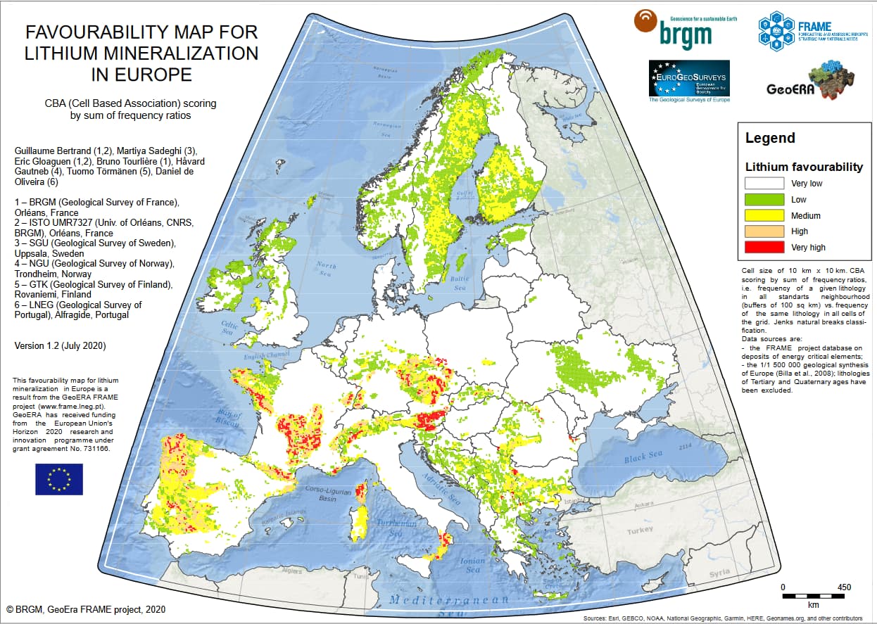 These are the results of an EU research project called the FRAME project. This is the visualization of how likely is to find lithium due to the exposed rocks (close to the surface) because of orogeny (formation of mountains due to plate tectonics). Based on this forecast, geologists go to the field and verify if the forecast becomes a reservoir/mine in the real world.