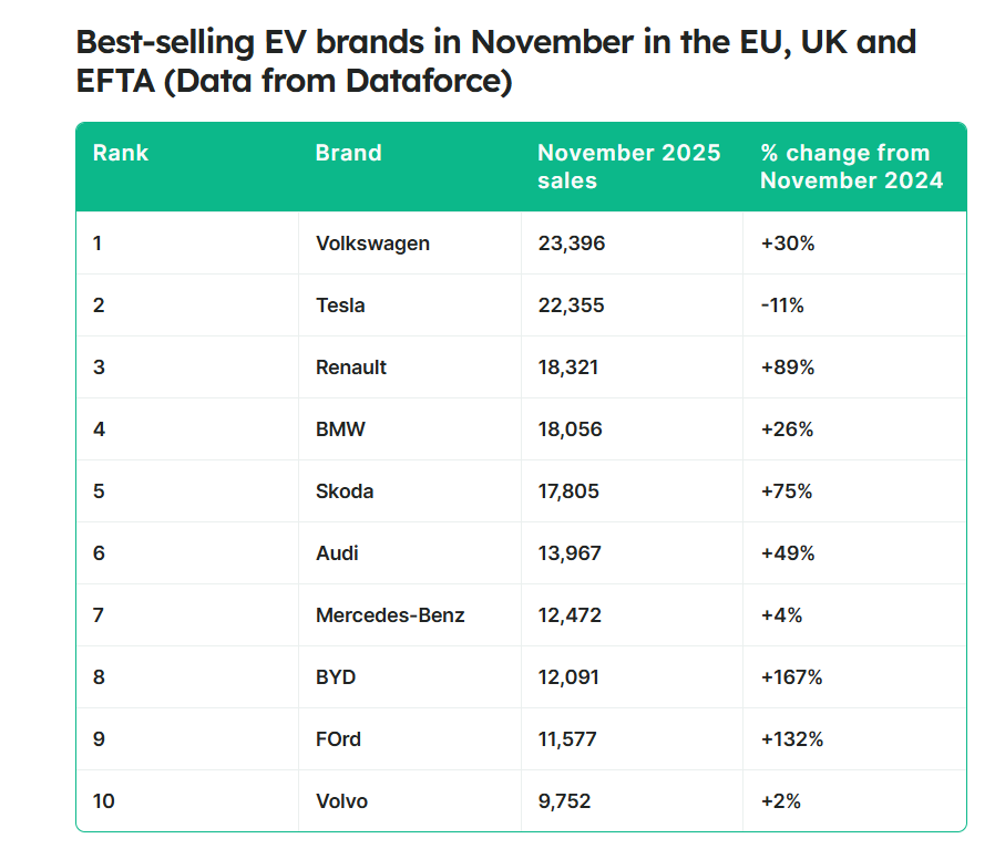 YTD VW ID4 + ID3 + ID7 has 210k sales vs 203K sales for Tesla Model 3 + Model Y but both brands have other EV models.