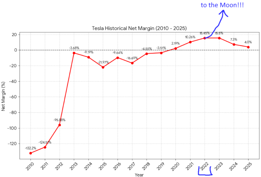Output from google gemini for " make a graph of tesla net margin historical, including 2025 ". 3 years ago, we lived in another world. People at the time said manufacturing efficiency and a vertically integrated manufacturing model were the reasons for the 15+% net margin. It was absolutely not consumer goodwill and high prices that had to be reduced when competition arrived.