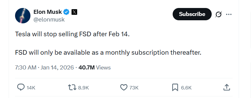 The online configurator has now been updated to allow buyers to choose the $99/month FSD subscription, while still offering the option to purchase FSD outright for $8,000 until February 14th