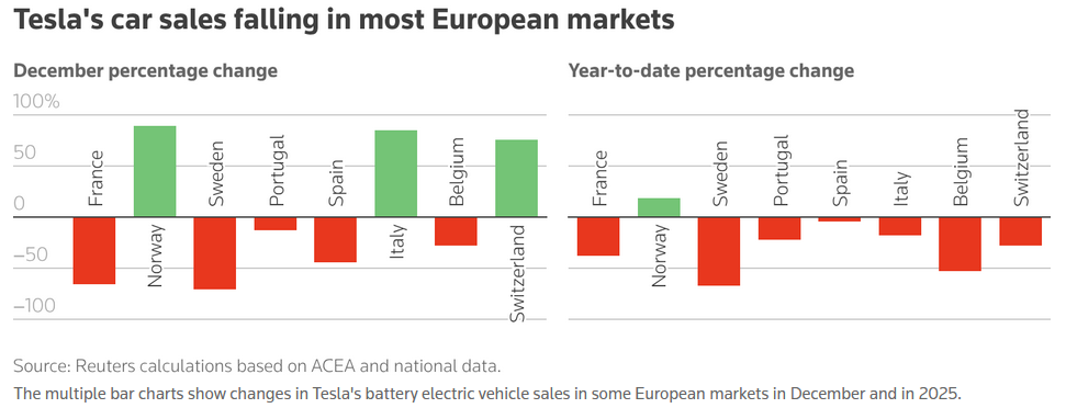 The ACEA will release full-year sales data for Europe later in January. In the eight countries that reported on Friday, together accounting for over half of Tesla’s market in Europe, registrations dropped in total by around 25% in 2025.