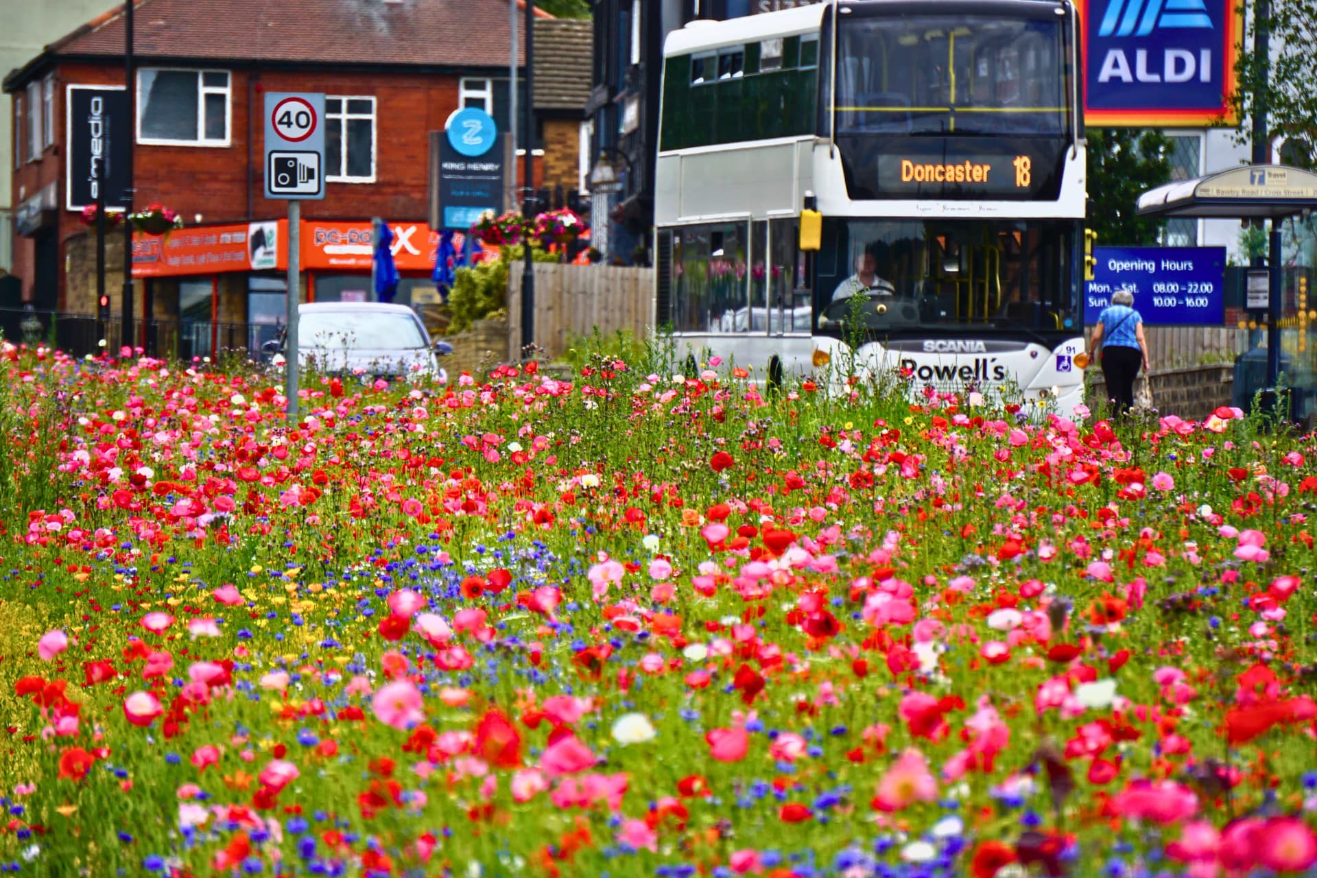 The council dug up the grass on a 8 mile long wide strip along a road into the town and planted wild flowers carefully selected so there would be some flowers blooming most of the time during flowering season.