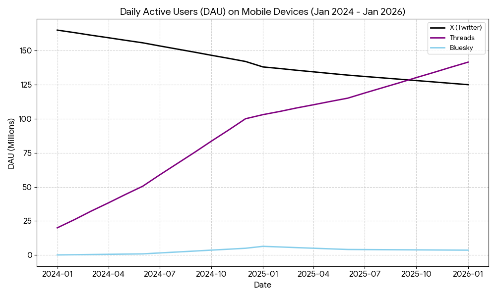 Jan 2026 update, threads overtakes twitter on daily active users (DAU) in mobiles devices.