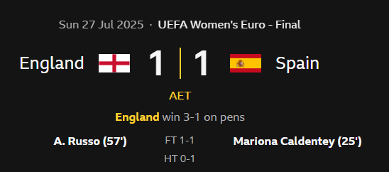 I really hate shoot-outs. England was outclassed for at least 90 out of the 120 minutes and then they win on penalties. Such a sad end to an otherwise excellent tournament.
