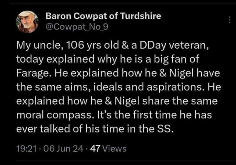 Apparently 1 in 10 Reform candidates are Facebook “friends” with a British fascist. Farage’s excuse seems to be that Reform hasn’t had time to vet its candidates and they probably liked inappropriate stuff online unwittingly because they’re “oiks” (well, he says rather irrelevantly that he’s sorry but not all Reform candidates went to Eton - he could have said Dulwich College).