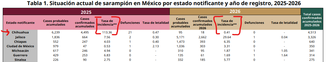 But, that was last year. The incidence rate (confirmed cases / 10k people) was the highest in Chihuahua in 2025, and dropped dramatically for 2026. Of course, only 2 months but if the incidence rate is multiplied for 6 to account for whole 2026 is still 2 orders of magnitude less than 2025. Outbreak is basically over in Chihuahua This is from the daily outbreak report by national authorities.